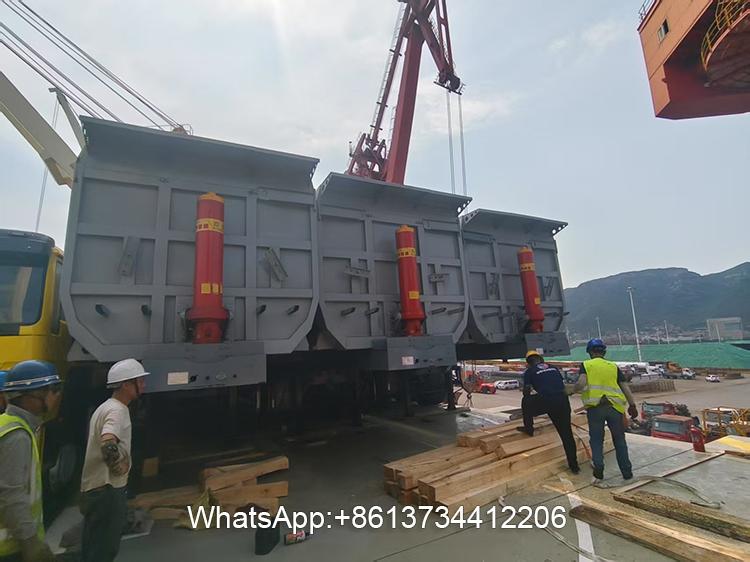 The three-axle dump semi-trailer for sale is a trailer designed for transporting bulk materials. It is equipped with three axles, which can provide better weight distribution and stability, especially when transporting heavy loads. This design helps reduce tire wear and improves handling performance. The dump semi-trailer uses a hydraulic lifting system, which can quickly tilt the cargo compartment for automatic unloading, and is suitable for bulk materials such as sand, coal, and grain. Compared with traditional manual or mechanical unloading, the unloading speed is several times faster, which is especially suitable for scenes such as construction sites and mining areas with frequent loading and unloading, greatly reducing time costs and labor requirements. This function is particularly suitable for efficient unloading of loose materials such as sand, gravel or soil. Made of durable materials such as high-strength steel, this three-axle side dump truck is designed to cope with harsh environments and heavy loads. Three-axle dump trucks usually have a large capacity, and their load capacity can reach 60 to 80 tons depending on the specific model and structure.